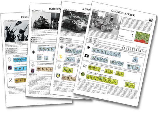 The scenario mix depicts mostly Free French units, alone or with allies but not only. Four of the scenarios can be linked in a mini-campaign :