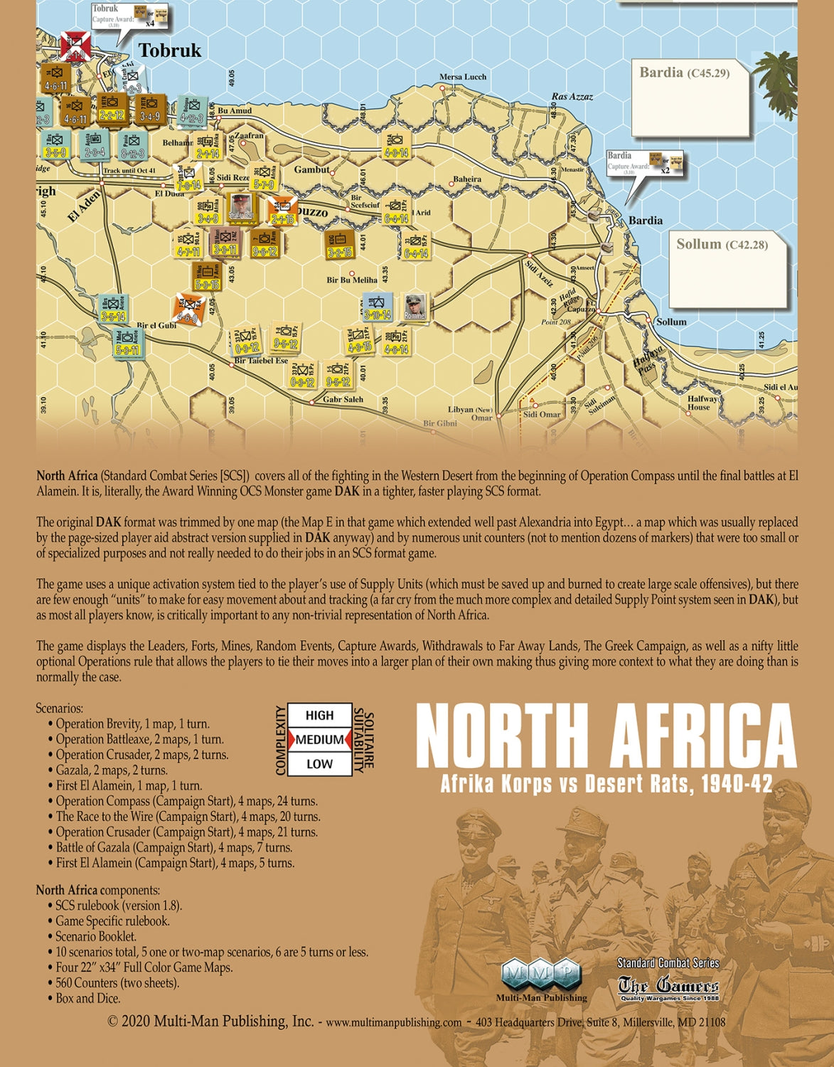 North Africa (Standard Combat Series [SCS]) covers all of the fighting in the Western Desert from the beginning of Operation COMPASS until the final battles at El Alamein. This is the award-winning Operational Combat Series monster game DAK in a tighter, faster-playing SCS format.