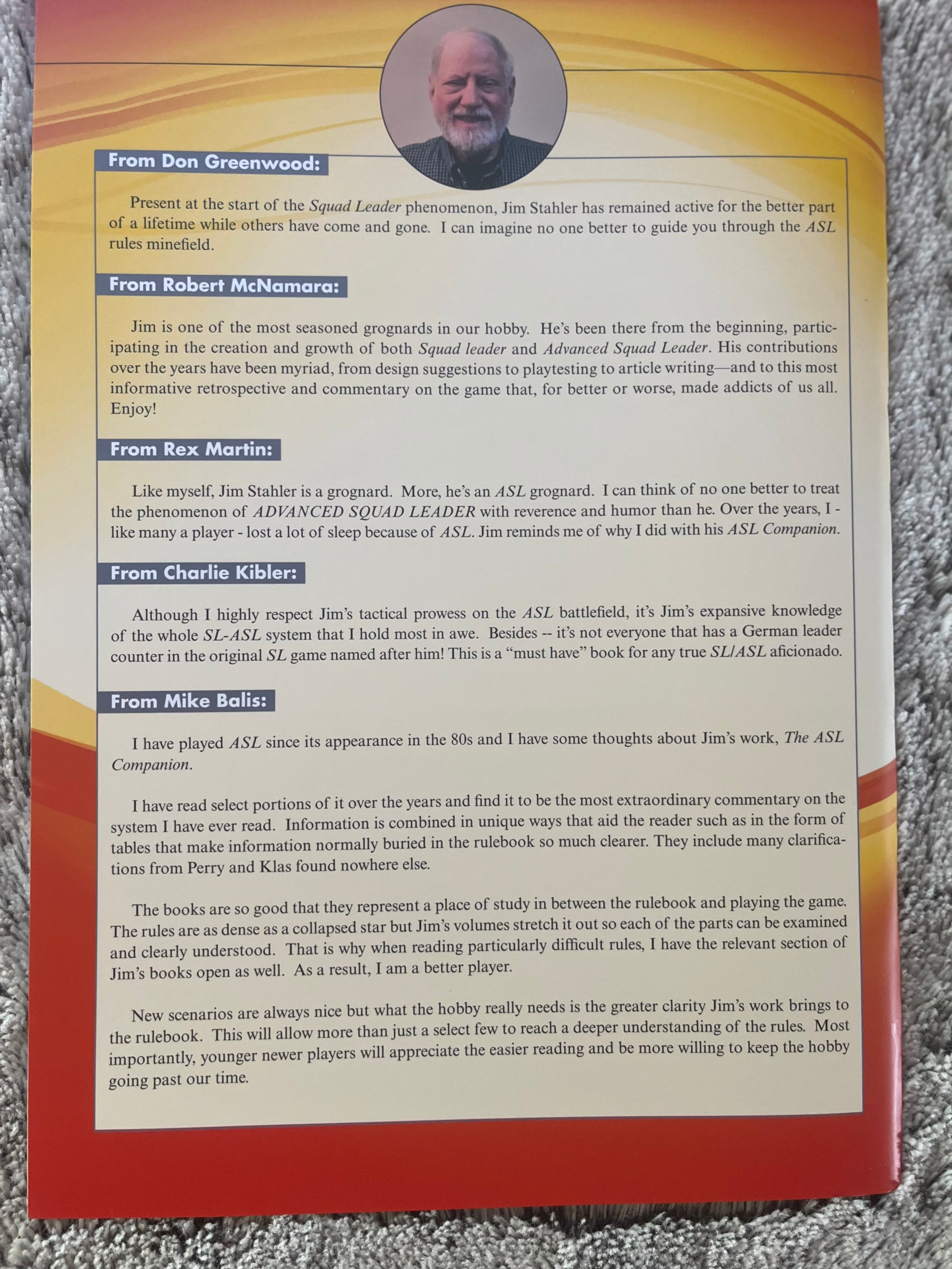 Jim Stahler has been involved in Squad Leader and Advanced Squad Leader for nearly half a century. He was one of the original playtesters for both Squad Leader and ASL and he has been a playtester for all of the Squad Leader modules and many of the ASL modules. He has written numerous articles about ASL published in the Avalon Hill General, the ASL Annual, and the ASL Journal. He has updated the majority of the original scenarios from Squad Leader to ASL. He has drawn on his vast experience with the game system to create a comprehensive book focused on ASL, The ASL Companion.